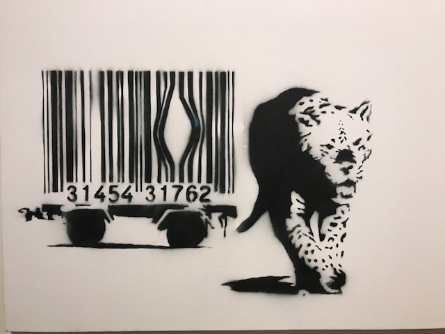 Das private MOCO Museum Amsterdam zeigte eine nicht autorisierte Schau von Arbeiten des britischen street art Künstlers Banksy. Eins seiner Werke, Girl with Balloon, letzten Oktober bei Sotheby's für 1.3 Mio. Euro versteigert, hatte sich unmittelbar nach der Auktion selbst geschreddert; ein radikales Statement des anonym bleibenden Künstlers gegen den Kunstmarkt. Doch nach Amsterdam. Es war eindrücklich, die Motive versammelt zu sehen, die Banksy berühmt machten: das erwähnte Girl with Balloon, die Kids on Guns, den Leoparden, der aus dem Barcode ausbricht u.a.m. Viele junge Menschen drängten durch die Räume und am Schluss in den Verkaufsshop, wo es all die Graffittis auf T-Shirts und Tassen als Souvenirs zu kaufen gab. Auch den Leoparden, Inbegriff von Natur und Freiheit.